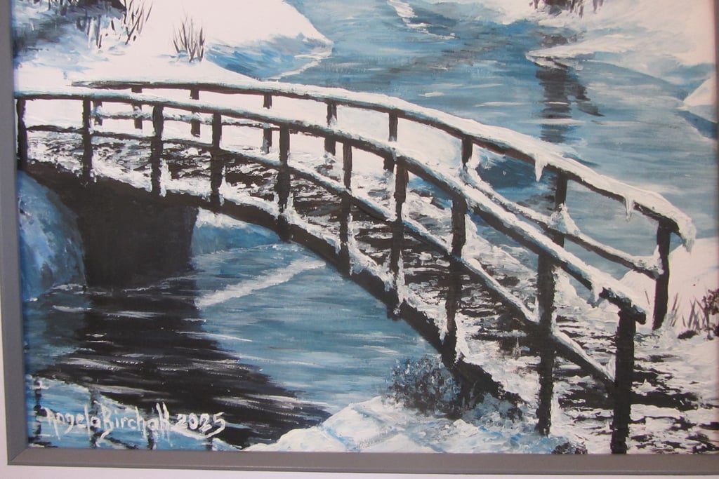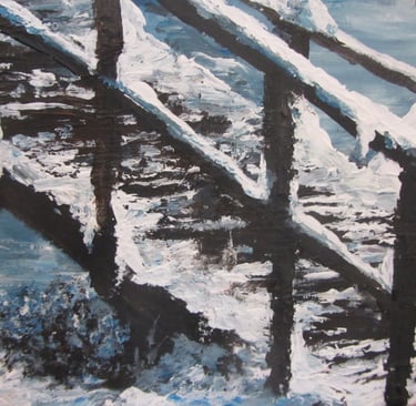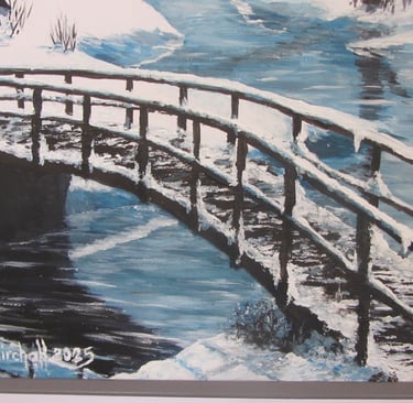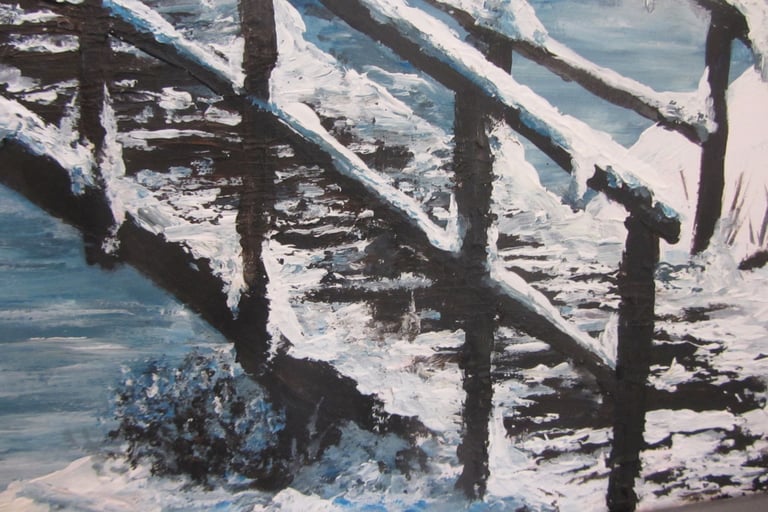 On the other hand, if you do it in acrylics or oils you can get a brush or palette knife and pile heaps of snow (aka thick white paint) onto any object in the painting such as the branches of trees, roofs of buildings, and, in this instance, the posts and rails of the bridge. The bonus is that if you get towards the end of the painting and the snow is looking a little sparse, you can just add heaps more white snow/paint onto any surface whereas with watercolours, the more you paint the less snow is left.