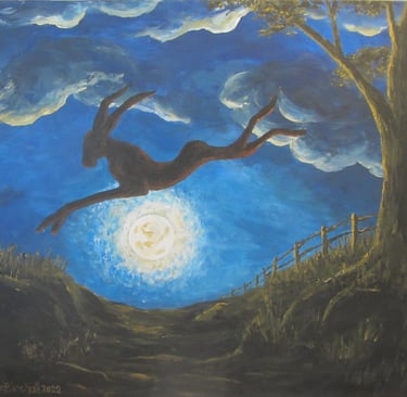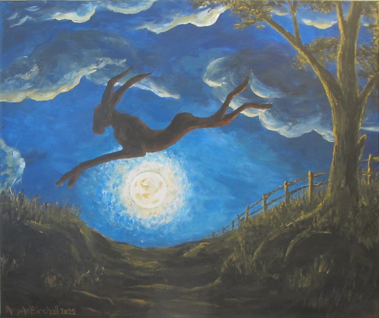 Even without the flattering build up, it was great fun as well as inspiring to take the shape of the leaping hare and the idea of the sun or moon disc being placed in just the right position for him to appear to be leaping over it and bring the two to life in a dramatic landscape. I went back to her and asked if she preferred the idea of a red setting sun or the blues and golds of moonlight and she chose the latter. “Hare by Moonlight” is the result.