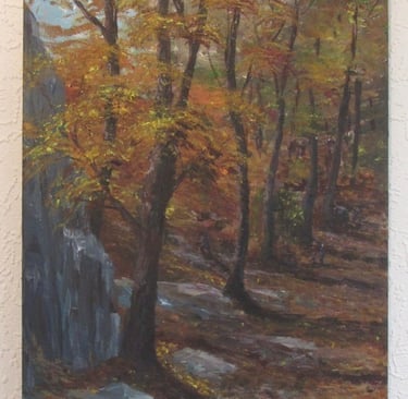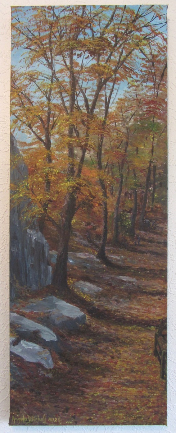 For instance, a walk in the Normandy spa town of Bagnoles De l’Orne with a friend who was visiting us in autumn became this scene in acrylics on canvas: