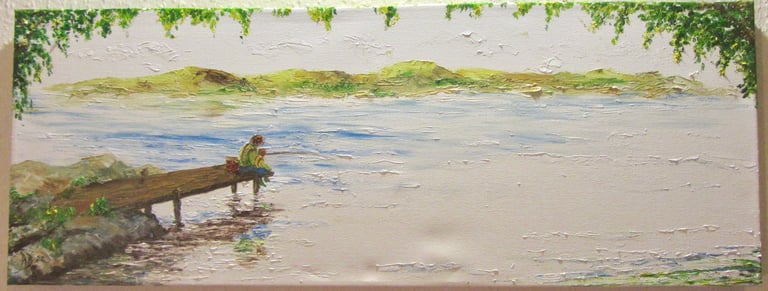 It’s not just my inspiring memories that I can bring to life on a canvas. We’ve already seen how Susie’s fascination with the hare sculpture inspired the “Hare by Moonlight” painting, and in the same way, hearing a friend recalling with touching tenderness his favourite childhood days of going fishing with his dad inspired this oil painting.